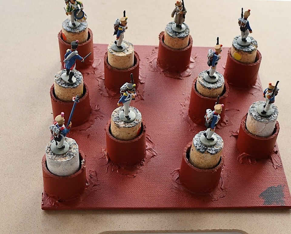 The above photo shows my new method of painting organisation. I paint in groups of no more than 10 figures at a time now. I made a little gizmo from an 8” x 8” piece of cardboard (I used an artists canvas panel). Then cut down a thick cardboard tube into 1” sections and glued them to the board using blobs of ‘No More Nails’ … hence it looks a bit like spot welding! Each tube takes a standard cork, which makes handling each figure easy. The whole thing was sprayed with a rattle can primer that I don’t like and wanted to get it used up.