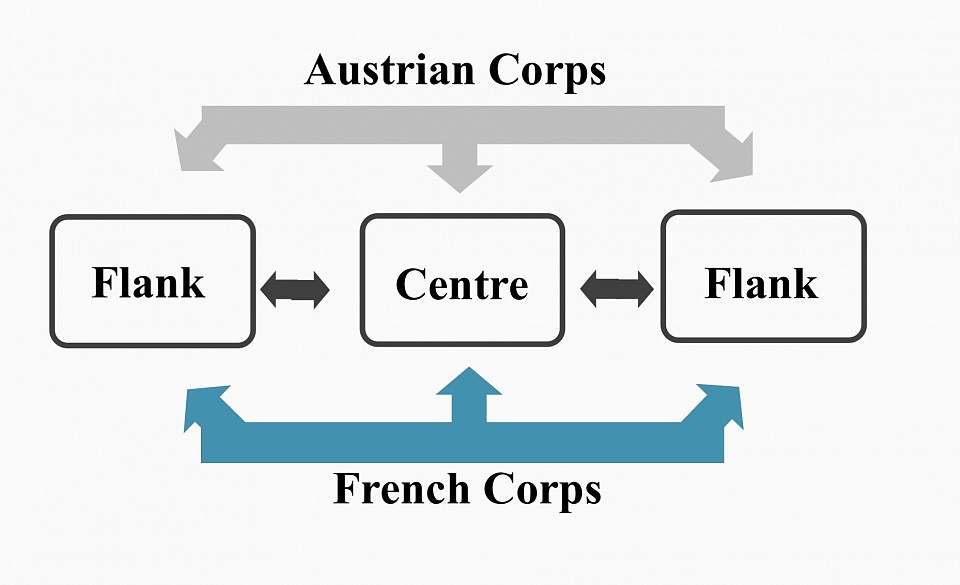 Each corps has 3 divisional sized formations and each of those is allocated to one of the three tables. The tables offer the centre and the two flanks / wings of the engagement.
