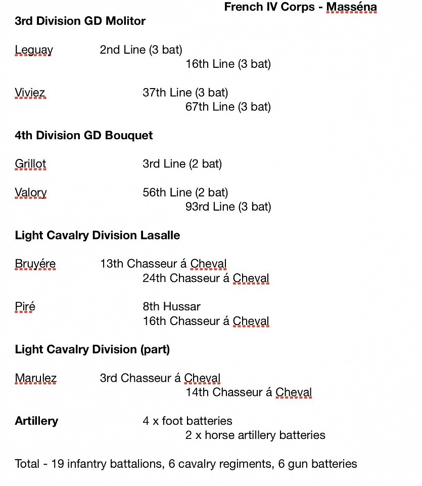 At his immediate disposal are two infantry divisions (3rd - Molitor and 4th - Boquet), Lasalle's Light Cavalry Division and one light cavalry brigade under Marulaz.